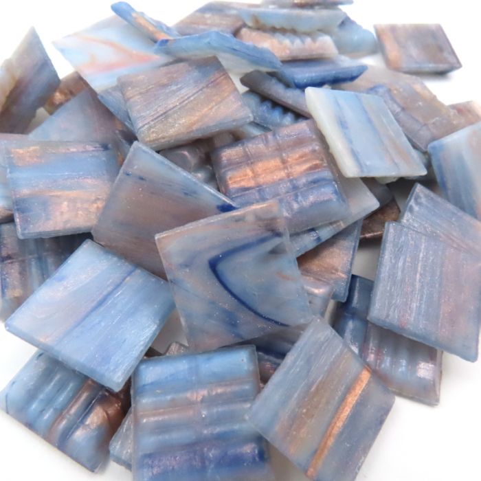 Superior quality vitreous glass mosaic from the same factory as Bisazza. 196 tiles, paper mounted on a sheet of 30×30 cm; each tile is 20mm² and 4mm thick. 11 sheets = 1m² . Each sheet weighs approx. 700g. High-temperature vitreous glass. UVA- and frost-resistant. Suitable for pools, spas, bathrooms, walls, and floors. Marbled effect acheieved by mixing molten glass in multiple colours. Some transparency may occur within individual tiles. Smooth, slightly striated finish on the surface.