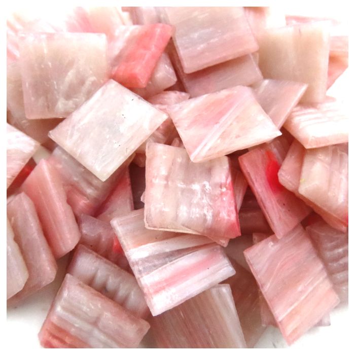 Superior quality vitreous glass mosaic from the same factory as Bisazza. 196 tiles, paper mounted on a sheet of 30×30 cm; each tile is 20mm² and 4mm thick. 11 sheets = 1m² . Each sheet weighs approx. 700g. High-temperature vitreous glass. UVA- and frost-resistant. Suitable for pools, spas, bathrooms, walls, and floors. Marbled effect acheieved by mixing molten glass in multiple colours. Some transparency may occur within individual tiles. Smooth, slightly striated finish on the surface.