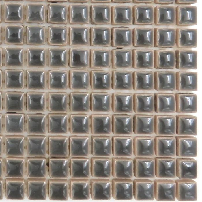 Hired-fired ceramic tile in versatile 10mm size. Each tile is 10x10x5mm with a high gloss glazed surface that is slightly domed (max. centre thickness of ±6mm). Traditional, durable, elegant and versatile, these tiles are mesh-mounted for installation on flat or curved surfaces as well as hobby projects both indoors and outdoors. UVA- and frost-resistant when used with suitable adhesive and grouts. Density and glaze making cutting difficult; best left whole.