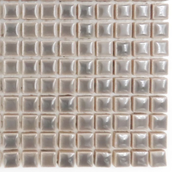 Hired-fired ceramic tile in versatile 10mm size. Each tile is 10x10x5mm with a high gloss glazed surface that is slightly domed (max. centre thickness of ±6mm). Traditional, durable, elegant and versatile, these tiles are mesh-mounted for installation on flat or curved surfaces as well as hobby projects both indoors and outdoors. UVA- and frost-resistant when used with suitable adhesive and grouts. Density and glaze making cutting difficult; best left whole.