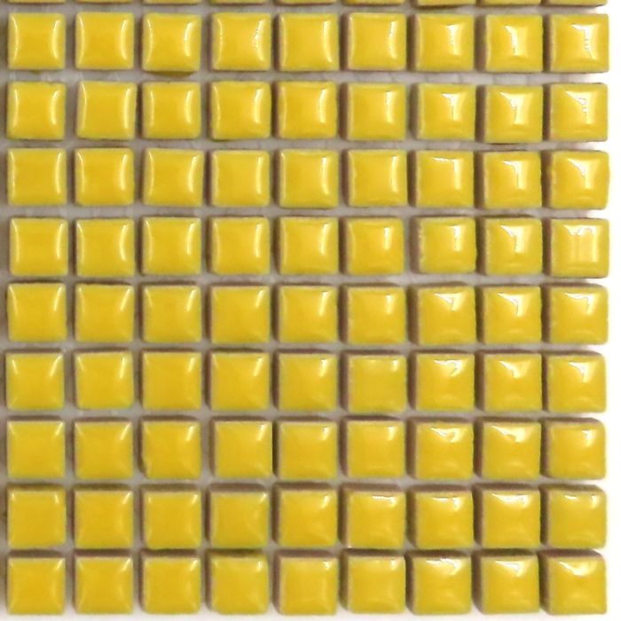 Hired-fired ceramic tile in versatile 10mm size. Each tile is 10x10x5mm with a high gloss glazed surface that is slightly domed (max. centre thickness of ±6mm). Traditional, durable, elegant and versatile, these tiles are mesh-mounted for installation on flat or curved surfaces as well as hobby projects both indoors and outdoors. UVA- and frost-resistant when used with suitable adhesive and grouts. Density and glaze making cutting difficult; best left whole.