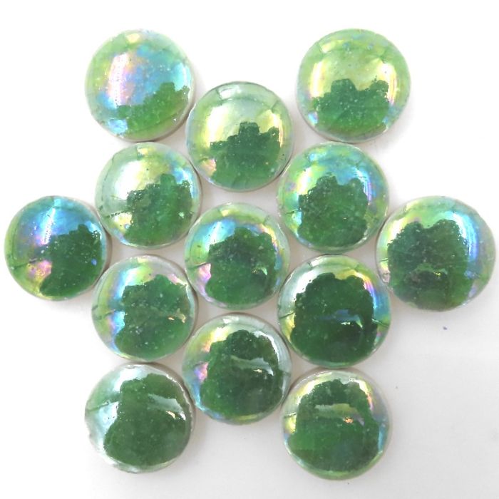 A wonderful round tile that is hand molded and glazed with multiple layers of crackle glass and then acid washed for a permanent pearlised gloss. The gold and silver are electroplated with an antique acid wash finish. Spectacular in combination with matte glass or stone tiles as well as standard ceramic tesserae. As this product is hand made in metal mols the size may vary slightly due to shrinkage, most are between 16-18mm in diameter. This shrinkage also leads to a slight swelling giving a domed or rounded aspect with the centre of each tile slightly thicker than the edges, the thickness is +/-6mm. The edges are straight and well defined. The glaze is hand painted in a minimum of 3 layers giving a beautiful luster with the colour lighter on the egdges and deeper in the center. During rapid cooling the craquelé occurs for a highly desirable artistic effect. Finally to create a permanent mother of pearl effect the tiles are soaked in a strong acid to etch the surface.