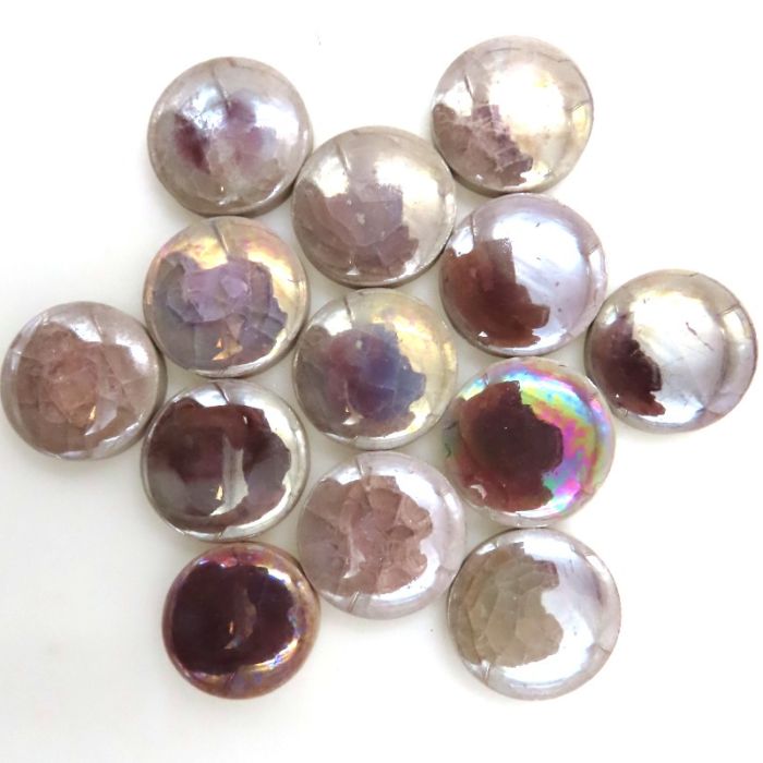 A wonderful round tile that is hand molded and glazed with multiple layers of crackle glass and then acid washed for a permanent pearlised gloss. The gold and silver are electroplated with an antique acid wash finish. Spectacular in combination with matte glass or stone tiles as well as standard ceramic tesserae. As this product is hand made in metal mols the size may vary slightly due to shrinkage, most are between 16-18mm in diameter. This shrinkage also leads to a slight swelling giving a domed or rounded aspect with the centre of each tile slightly thicker than the edges, the thickness is +/-6mm. The edges are straight and well defined. The glaze is hand painted in a minimum of 3 layers giving a beautiful luster with the colour lighter on the egdges and deeper in the center. During rapid cooling the craquelé occurs for a highly desirable artistic effect. Finally to create a permanent mother of pearl effect the tiles are soaked in a strong acid to etch the surface.