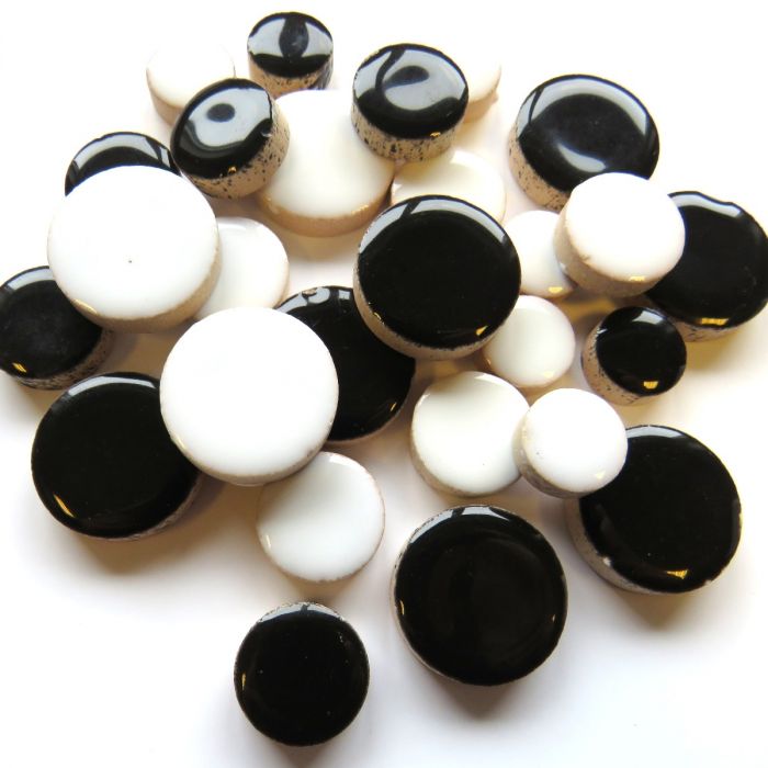 Multi sized mix of glazed ceramic circles in a mix of 12mm, 15mm, and 20mm diameter. All are 5mm thick and low fired...