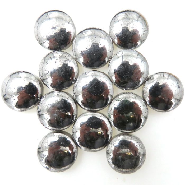 A wonderful round tile that is hand molded and glazed with multiple layers of crackle glass and then acid washed for a permanent pearlised gloss. The gold and silver are electroplated with an antique acid wash finish. Spectacular in combination with matte glass or stone tiles as well as standard ceramic tesserae. As this product is hand made in metal mols the size may vary slightly due to shrinkage, most are between 16-18mm in diameter. This shrinkage also leads to a slight swelling giving a domed or rounded aspect with the centre of each tile slightly thicker than the edges, the thickness is +/-6mm. The edges are straight and well defined. The glaze is hand painted in a minimum of 3 layers giving a beautiful luster with the colour lighter on the egdges and deeper in the center. During rapid cooling the craquelé occurs for a highly desirable artistic effect. Finally to create a permanent mother of pearl effect the tiles are soaked in a strong acid to etch the surface.