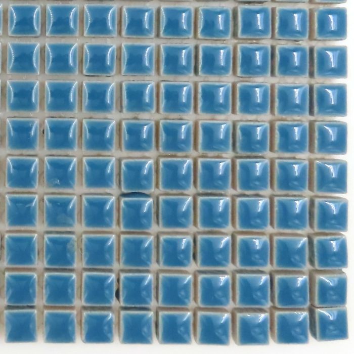 Hired-fired ceramic tile in versatile 10mm size. Each tile is 10x10x5mm with a high gloss glazed surface that is slightly domed (max. centre thickness of ±6mm). Traditional, durable, elegant and versatile, these tiles are mesh-mounted for installation on flat or curved surfaces as well as hobby projects both indoors and outdoors. UVA- and frost-resistant when used with suitable adhesive and grouts. Density and glaze making cutting difficult; best left whole.