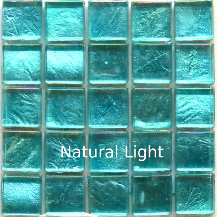 This line is a reproduction based on Sicis Colibri Iridised but is much more affordable; the molded transparent glass has metallic foil heat-bonded to the back to produce a vivid, mirror-like reflective tile. As the colour of the glass is actually reflected, it is frost-proof and UVA-resistant; it may, however, experience some colour change or spotting in direct sunlight or when exposed to chlorine or salt. The tiles may be cut but care must be taken that the foil is not damaged behind during cutting. Each tile is 15mm² and 3.5mm thick. 1 sheet = 400 tiles (32.7×32.7cm); 9.4 sheets = 1m².