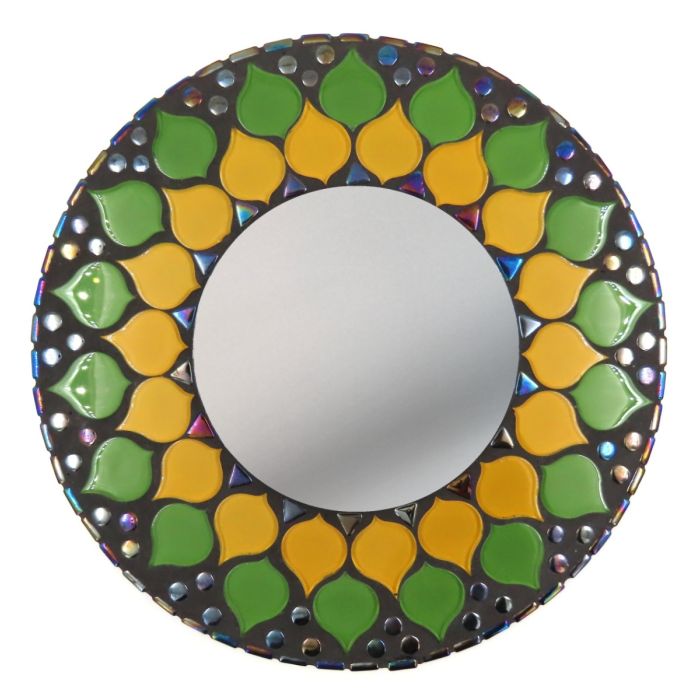 Simple and beautiful. This eye catching mirror requires no cutting or tools. It relies on precision and geometric repetition using our exclusive float glass shapes. based on a birch plywood round. All tiles, base, glue and grout are included along with easy step by step instructions. This is a great first project.