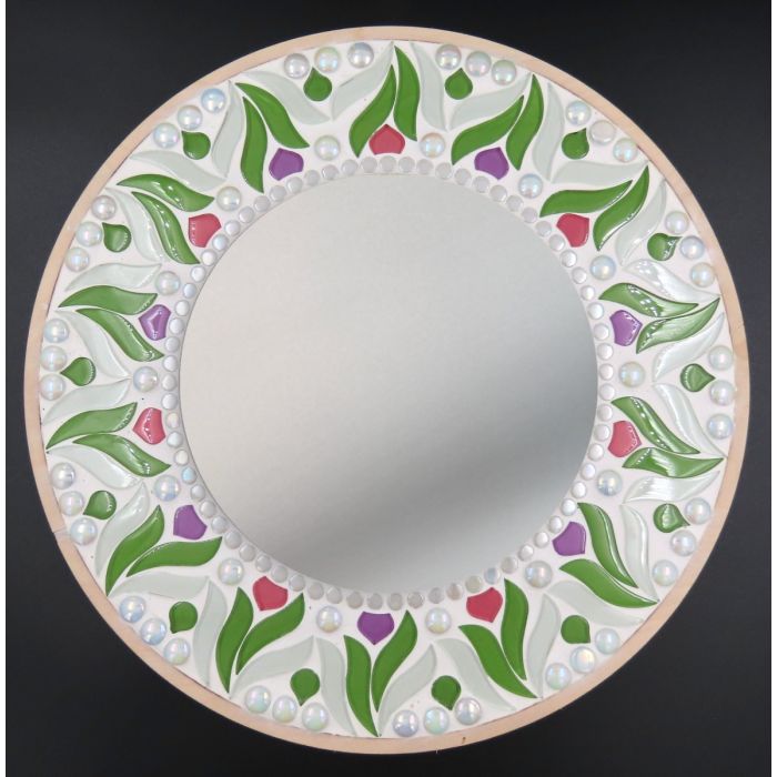 Simple and beautiful. This eye catching mirror requires no cutting or tools. It relies on precision and geometric repetition using our exclusive float glass shapes. based on a birch plywood round. All tiles, base, glue and grout are included along with easy step by step instructions. This is a great first project.