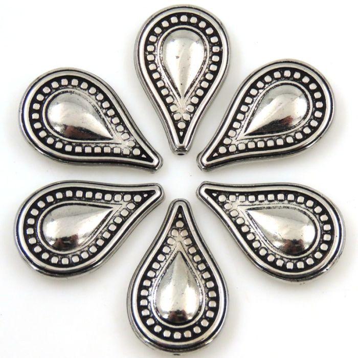 Machine cast acylic with silver tone electrocoating, attractive teardrop shape with Tibetan bead detailing.