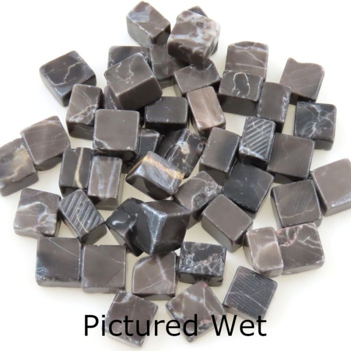 Machine cut and tumbled natural stone and marble cuboids. This size makes them wonderfully versatile without requiring cutting. They may be used in traditional Romanesque mosaics or given a modern twist by combining them with glass or ceramic tesserae. If you do want to cut them, consider using a hammer and hardie or a geared porcelain tile cutter. As stones vary in hardness, some are slightly softer and may become more rounded during tumbling. To bring out the full beauty and colour of this product, please seal with a stone or marble sealant. The 7mm thickness means they align perfectly with smalti when placed on their sides. Each is 10×10 mm and 7mm thick. 100g = ±70 pieces・1kg = ±700 pieces・1m² = ±14 kg