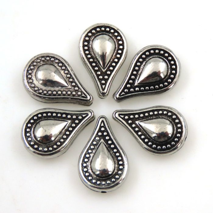 Machine cast acylic with silver tone electrocoating, attractive teardrop shape with Tibetan bead detailing.