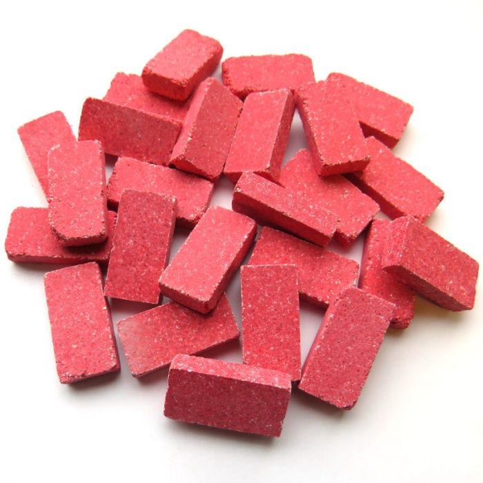 Made from cement powder combined ground dolomite and coloured with mineral oxides. This mixture is pressed at high pressure in a mould to form individual tiles that be cut with scissors or regular tile nippers and therefore perfect for children. Please note that using scissors gives a rougher more inaccurate cut. We carry 3 sizes 5mm and 20mm squares and 10x20mm rectangles. All tiles are approximately 4mm thick These tiles are not suitable for outdoor use unless properly protected from humidity during frost season and some fading may occur with UV exposure particularly colours (023, 024, 025, 026, 027). They look like traditional stones used in Byzantine and Roman mosaics but without the difficulty of working with natural stone. These tiles are porous and can be sealed using a stone sealer or diluted pVa. 5mm is packaged in 10g (+/-50 tiles) and 200g (+/-1000 tiles) 10mm is packaged in 50g (+/-53 tiles) and 1000g (+/-1050 tiles) 10x20mm is packaged in 50g (+/-21 tiles) and 1000g (+/-420 tiles)