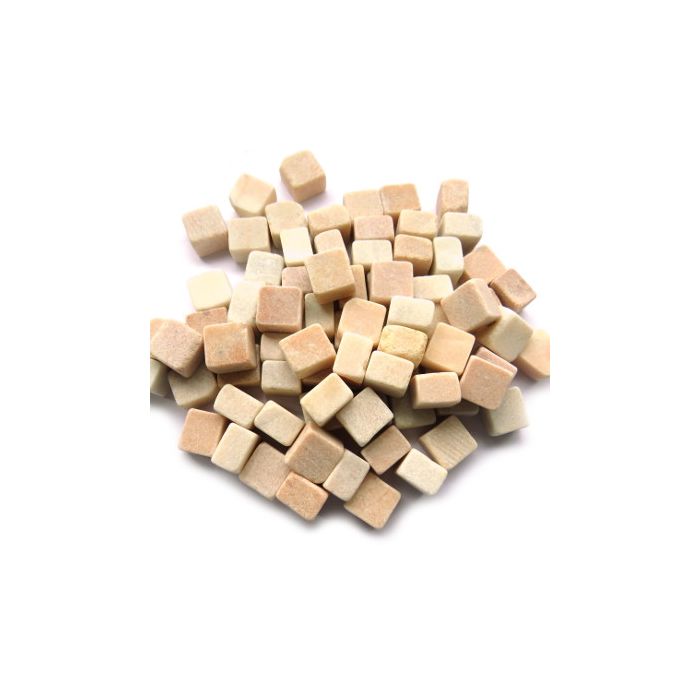Machine cut and tumbled natural stone and marble cuboids. This size makes them wonderfully versatile without requiring cutting. They may be used in traditional Romanesque mosaics or given a modern twist by combining them with glass or ceramic tesserae. If you do want to cut them, consider using a hammer and hardie or a geared porcelain tile cutter. As stones vary in hardness, some are slightly softer and may become more rounded during tumbling. To bring out the full beauty and colour of this product, please seal with a stone or marble sealant. The 7mm thickness means they align perfectly with smalti when placed on their sides. Each is 10×10 mm and 7mm thick. 100g = ±70 pieces・1kg = ±700 pieces・1m² = ±14 kg