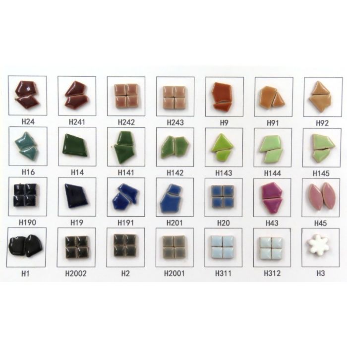 Sample card for our increasingly popular 10x10x4mm glazed ceramic mini mosaic.