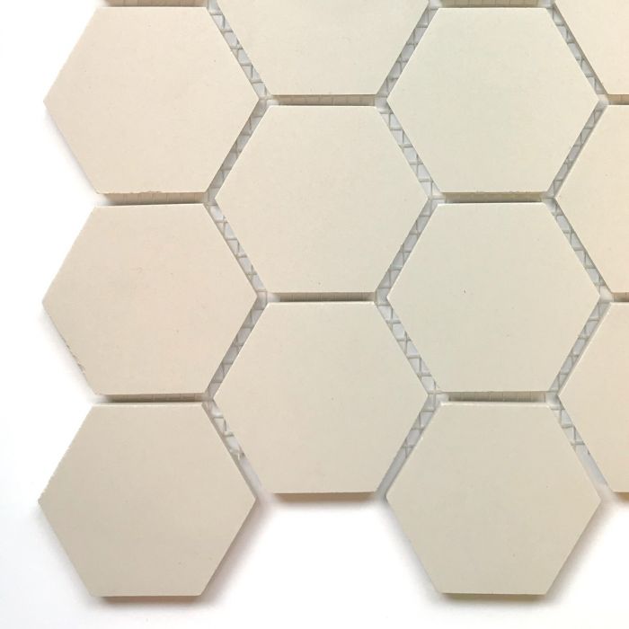 Classic French hexagon mosaic in heritage porcelain by Winckelmans. Each tile is 50mm across and 5mm thick. These are suitable for walls and residential floors. 1 sheet = 24 tiles (20×30 cm)・1m² = 16.7 sheets